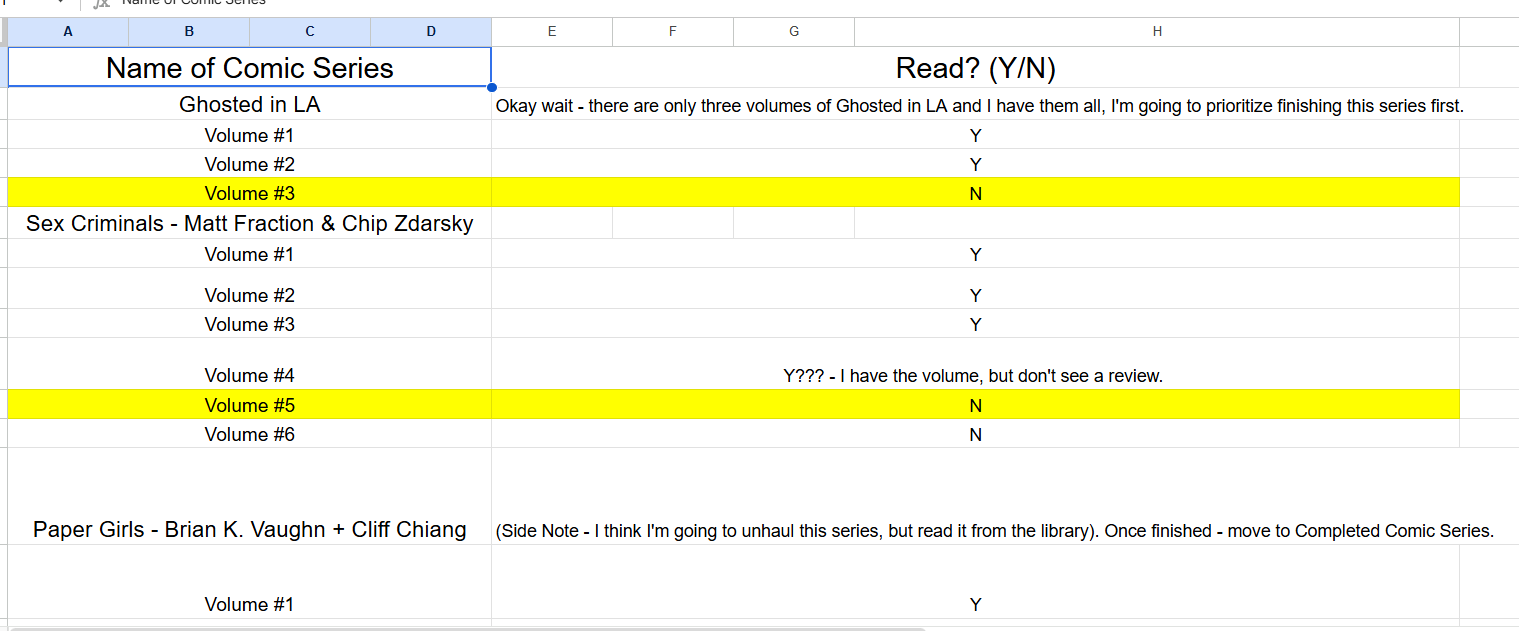 I decided to separate my comic series based on whether they were indie, so anything that’s not Marvel or DC, and then keep everything superhero-related on a separate sheet. I found keeping everything on one list made it long, so I think keeping it separate kept things more concise. This way, I can pick and choose the series I’m in the mood to read. The Comics Reading List is a list of comics that I want to read; it’s basically my TBR. The only graphic novel on that list so far is Supergirl: The Woman of Tomorrow by Tom King. This is the Supergirl graphic novel that inspired the Supergirl film coming out in June, so I’d like to read this before then. Completed Comic Series are series I’m all caught up on. I was surprised because there were more comics on here than I thought. Finally, I made a list of All-Time Favorite Graphic Novels and Comics, so comics I loved, but they were standalone and not part of a series. Unlike my Book Series Tracker, I don’t have a sheet created for series I am no longer continuing because I want to focus on what I love, not what I didn’t like.