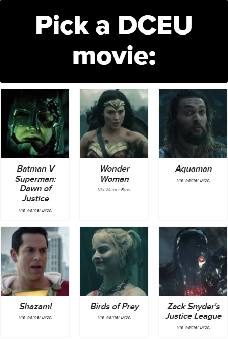 I picked Birds of Prey. Birds of Prey is such an underrated DC movie and the movie soundtrack was such an energetic fit to the film. A close second would be Wonder Woman. The only movie on this list I would never choose would be Batman V Superman. There wasn’t enough build-up to introduce Batman and Superman in the film. It was DC trying to get a Marvel cinematic universe without putting in the work to do so.