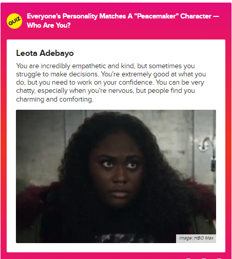 I finished watching the Peacemaker finale with my husband. It was so good! DC is having a ton of issues with their movie universe, but their TV shows have always been decent. After watching the finale, I searched and found a “Which Peacemaker Character Are You” Buzzfeed quiz and wanted to take it. I hope I don’t get Peacemaker.