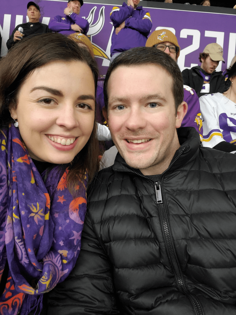 At this point, I’m sweaty and my heart is beating out of my chest. My Fit Bit recorded this as a workout for the day; that’s how energized I was. Overtime began and The Vikings won the coin toss. Winning the coin toss in overtime is crucial because if you score first, you win. However, The Vikings didn’t score when they had the ball. This meant The Colts had a chance to score. The Vikings stopped them and we got the ball back. At this point, fans are absolutely jumping up from their seats and standing to watch the game.