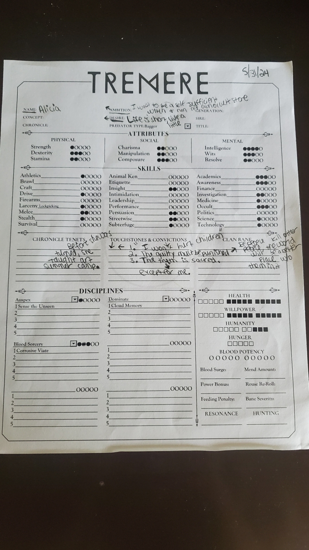 The DM running our Vampire session was the same DM who ran the Curse of Strahd campaign I was in, so it felt like a mini-reunion. To prepare for the session, our DM had pre-generated characters to pick from. I liked this a lot because it had been a while since I created a character from scratch, so having readily available options worked quite well for me. Whenever I play Vampire, I usually pick the Toreador or Ventrue clans. I wanted to choose something different and picked Tremere. Tremere is the Blood Witch clan who experiments with Blood Magic. While there wasn’t much time to experiment with all of my character’s abilities, I liked playing Tremere as a clan.